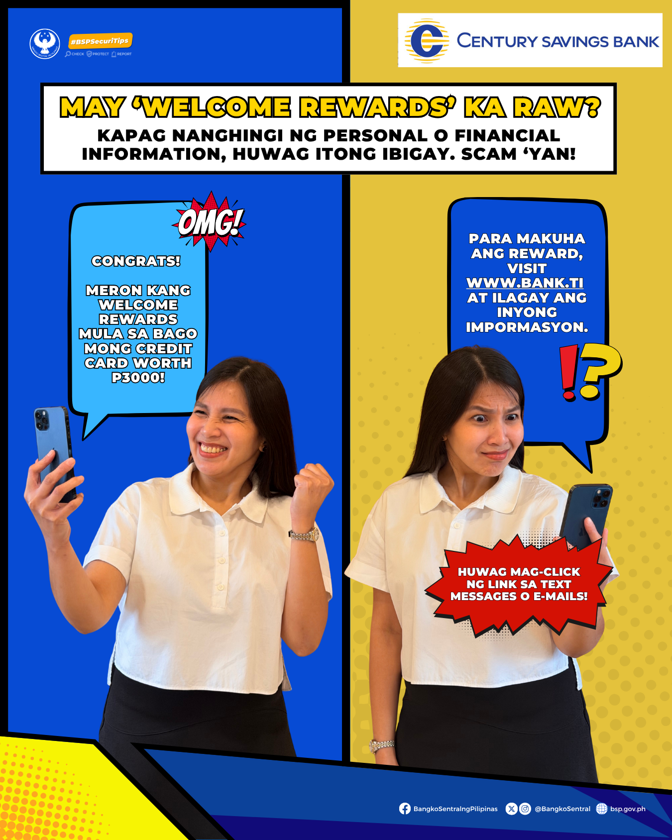 #BSPSecuriTips: May offer na “welcome rewards” mula sa credit card o iba pang produkto ng iyong bangko? Huwag agad ma-excite at magtiwala! I-verify muna sa mga official channels.