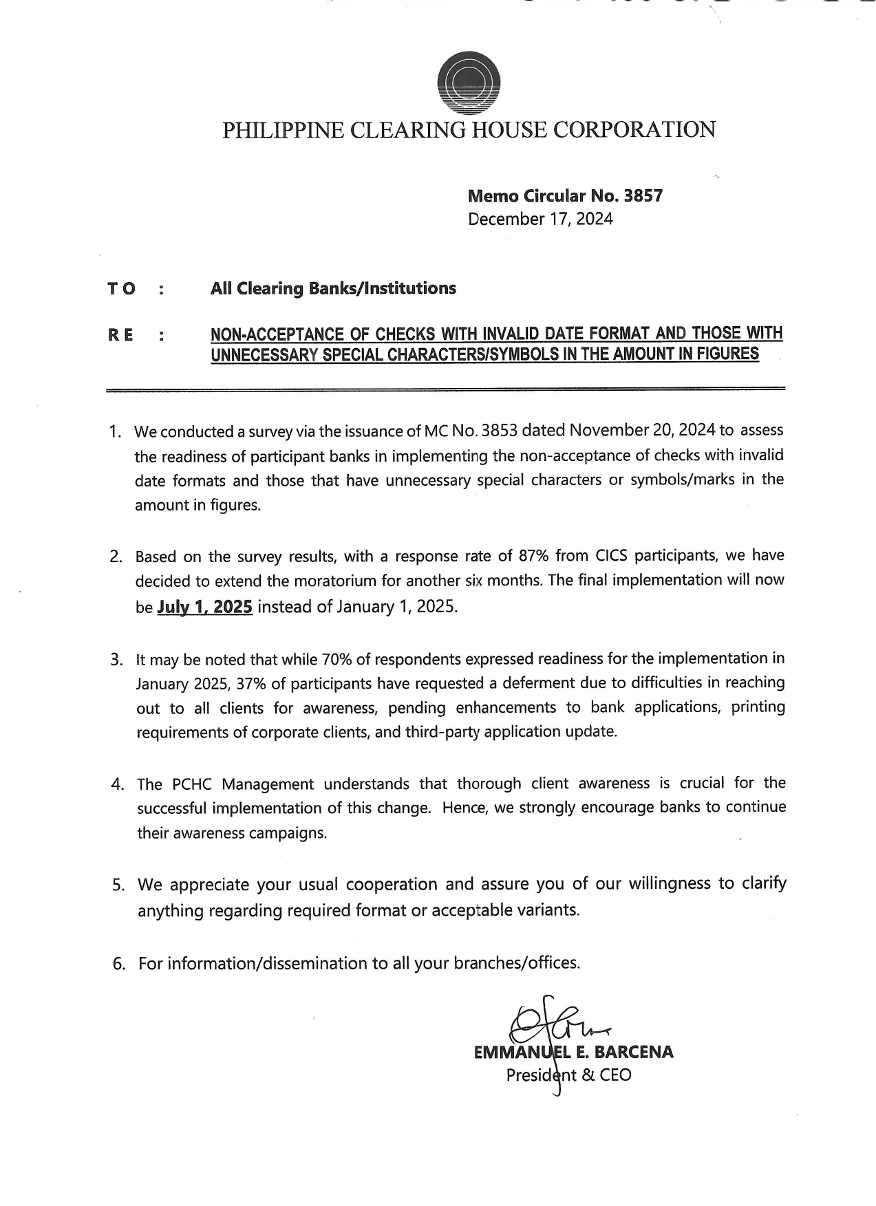 Century Savings Bank would like to remind customers of the memo from PCHC regarding updated check designs. More information may be found in the full memo. PCHC Memo Circular No. 3855: RE: INDICATING FRONT DEPOSIT INFORMATION ON CHECKS FOR MOBILE DEPOSIT PCHC Memo Circular No. 3857: RE: effective July 1, 2025, outlines the new check design standards for checks in the Philippines.