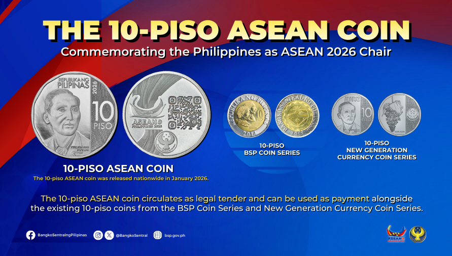 The Bangko Sentral ng Pilipinas (BSP) will issue the 10-Piso ASEAN coin nationwide in January 2026 to commemorate the Philippines’ role as ASEAN Chair in 2026.